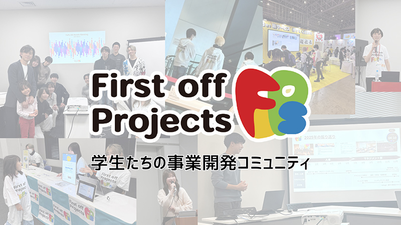 私たち「First off Projects」は、高校生・大学生・専門学校生が集まるビジネスコミュニティです。学生たちのキャリアのスタート地点として、自分たちのアイデアを実際に開発し、社会に発表する活動を行っています。